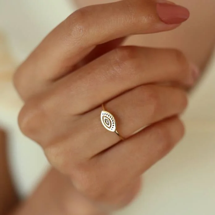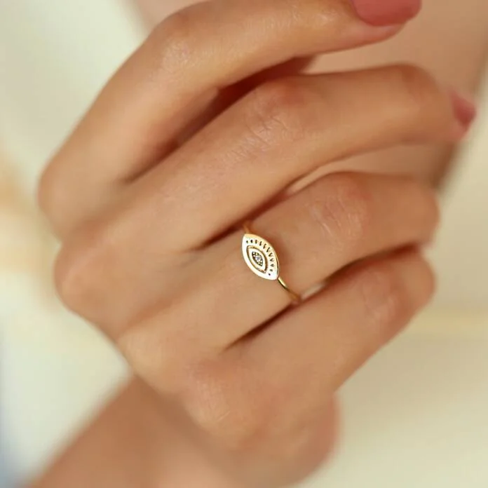 Kirpik Plaka Yüzük, 14 ayar altının zarafetiyle modern bir sembolizmi buluşturan özel tasarıma sahiptir. Nazar ve kötü enerjiden korunma anlamı taşıyan bu yüzük, minimal tarzıyla günlük kombinlerinize anlam ve şıklık katar.