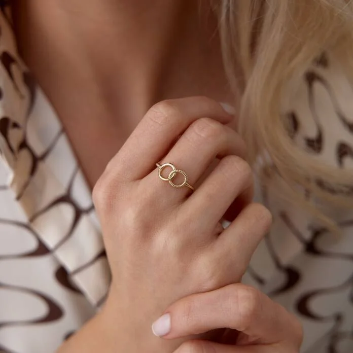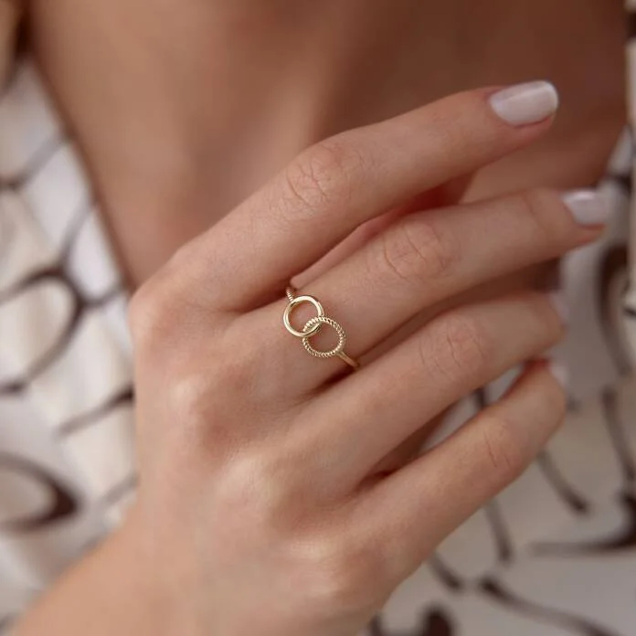Özel formu ve anlamlı tasarımıyla öne çıkan Kördüğüm Halka Yüzük, 14 ayar altının parlaklığını kördüğüm motifiyle buluşturuyor. Düğüm, bağlılığı ve kalıcılığı simgelerken; halka formuyla sonsuzluğu ve sürekliliği temsil ediyor.
