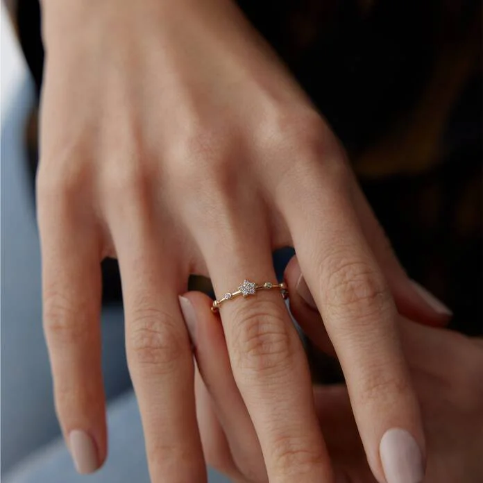 Gökyüzünün büyüleyici parıltısından ilham alınan Taşlı Yıldız Yüzük, 14 ayar altının zarif dokusunu yıldız formu ve taşların göz kamaştıran ışıltısıyla buluşturuyor. Yıldız; umut, ışık ve yol göstericiliğin sembolü olarak bu yüzüğe derin bir anlam katıyor.